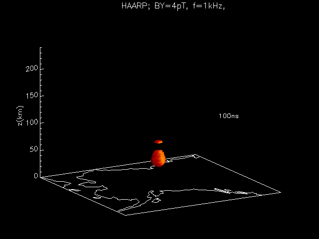 Because 1 kHz is below cutoff the mode in the waveguide is a TEM mode. The mode consists of a horizontal B field perpendicular to the direction of propagation and a vertical electric field. With perfect conductors, the mode is uniform in the vertical direction. As the wave propagates in the waveguide, the top of the wave is approximately at the bottom of the ionosphere. Above the heated region, waves are also launched along the Earth's magnetic field. In the near-field ( BX1 and BY1) one can see the pulse being radiated downward. It strikes the ground and reflects back up to the ionosphere. Part of the energy propagates up the field lines into the ionosphere. This is the bubble seen rising up. The D-region is highly collisional and damps this wave. Looking at BX2 and BY2 one can see that the energy mainly stays in the waveguide. If one looks closely at the top of the wave in the waveguide the wave appears to be curved. The waveguide mode is coupling into the bottom of the D-region and driving a whistler mode up the field lines. The whistlers have a much lower velocity than the waveguide mode and can only propagate along the field lines. This acts to curve the top of the waves. These waves help form the bubble that propagates up the field line. Because of this, the diameter of the bubble is much larger than the heated region.