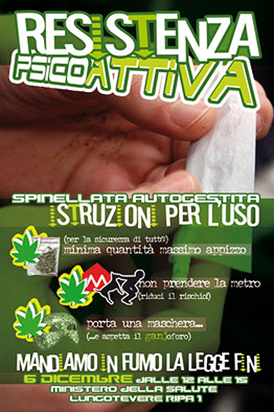 Il 6 dicembre il movimento antiproibizionista romano si da' appuntamento davanti al Ministero della salute, un'occasione per ribadire ed affermare "resistenza psico-attiva" contro la conferenza governativa sulle droghe che si svolgerà dal 5 al 7 dicembre a Palermo e contro l'assurdo punizionismo repressivo del ddl Fini-Mantovano, e dello stralcio Giovanardi che ne riprende tutti i punti salienti.