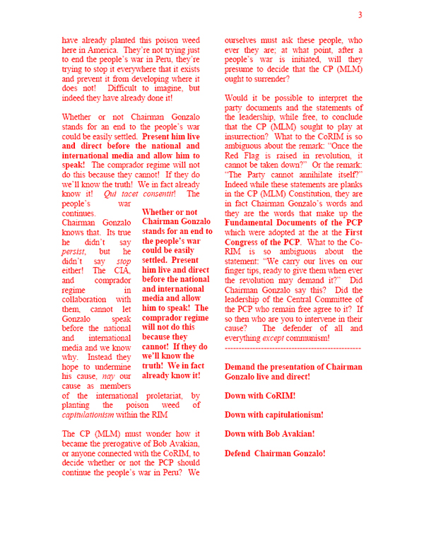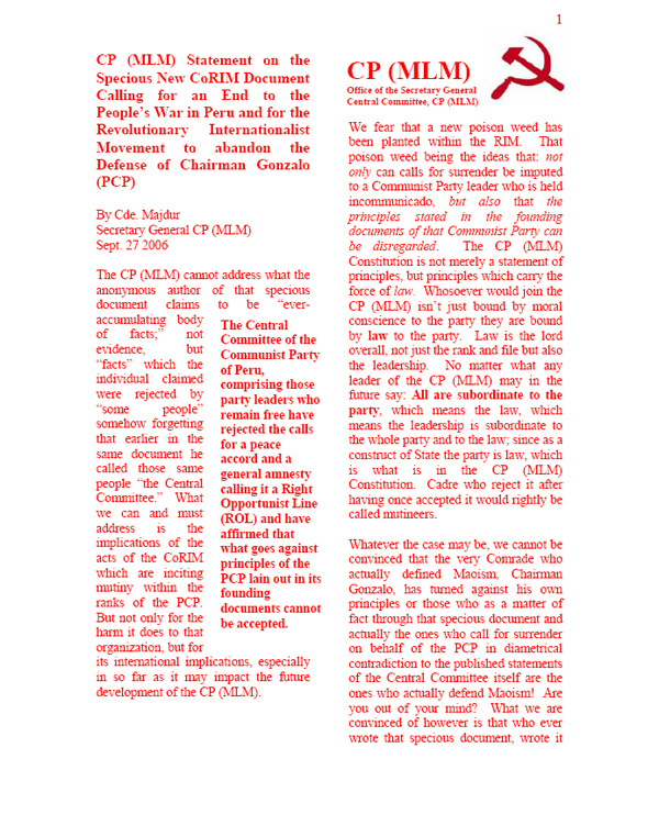 CP (MLM) Statement on the Specious New CoRIM Document Calling for an End to the People’s War in Peru and for the Revolutionary Internationalist Movement to abandon the Defense of Chairman Gonzalo (PCP)
