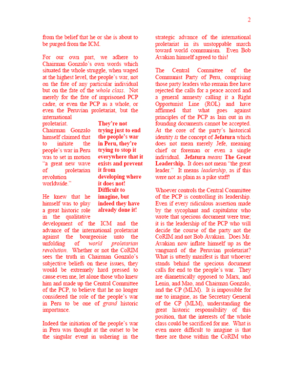 The CP (MLM) cannot address what the anonymous author of that specious document claims to be “ever-accumulating body of facts;” not evidence, but “facts” which the individual claimed were rejected by “some people” somehow forgetting that earlier in the same document he called those same people “the Central Committee.” What we can and must address is the implications of the acts of the CoRIM which are inciting mutiny within the ranks of the PCP. But not only for the harm it does to that organization, but for its international implications, especially in so far as it may impact the future development of the CP (MLM).