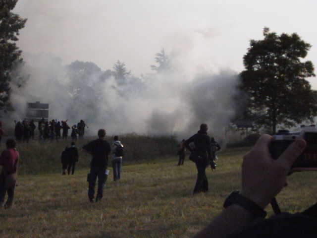 | il gruppo arretra dietro la barricata, respinto dai lacrimogeni | ||