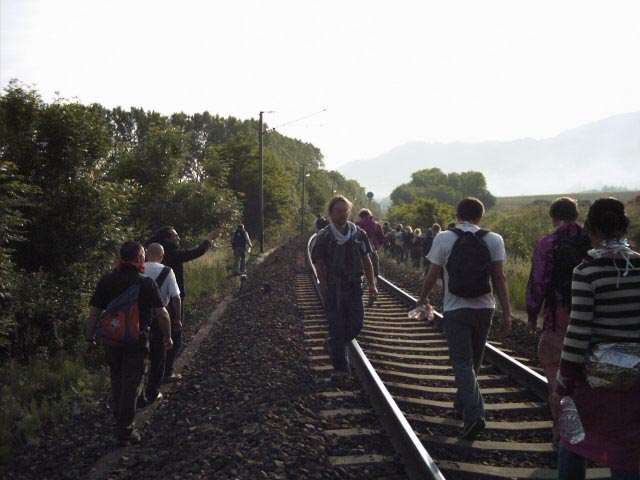 | il gruppo che si separa e percorre la ferrovia per aggirare il blocco della polizia | ||
