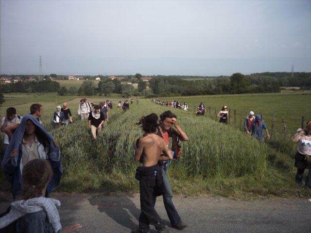 Alle 07:45 circa 150 manifestanti (spagnoli, francesi, tedeschi e 4 italiani), approfittando del fatto che i 2 elicotteri che tenevano d'occhio il corteo si erano allontanati hanno attraversato i campi e la ferrovia sulla sinistra della strada bloccata ed hanno raggiunto una stradina secondaria che avrebbe consentito loro di aggirare il blocco della polizia francese e arrivare all'incrocio del bivio per Evian. |