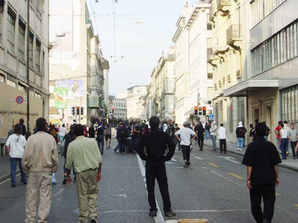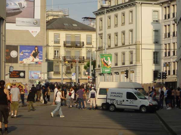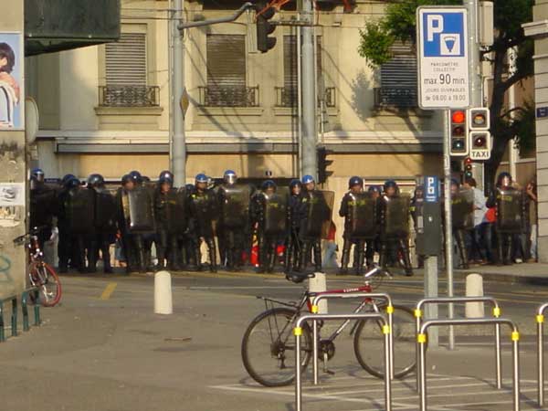 nel tardo pomeriggio del 1 giugno, gli scontri tra polizia e manifestanti arrivano fino alla zona del media center di ginevra usine.