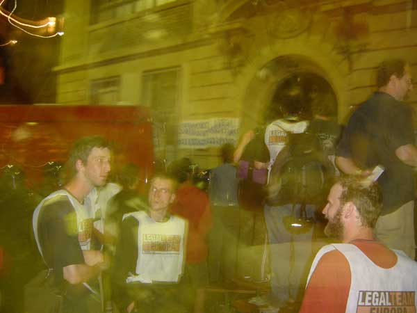un momento prima che arrivasse la polizia in borghese, la gente era ancora seduta in segno distensivo sui tavoli davanti al media center, mangiando, alcuni coprono la porta d'ingresso.