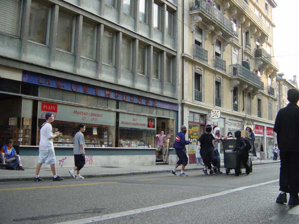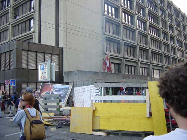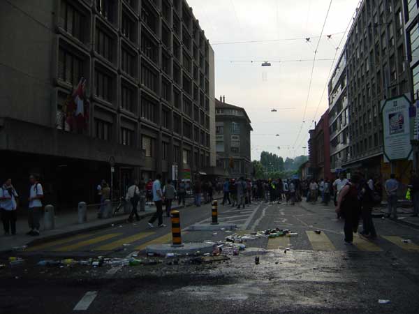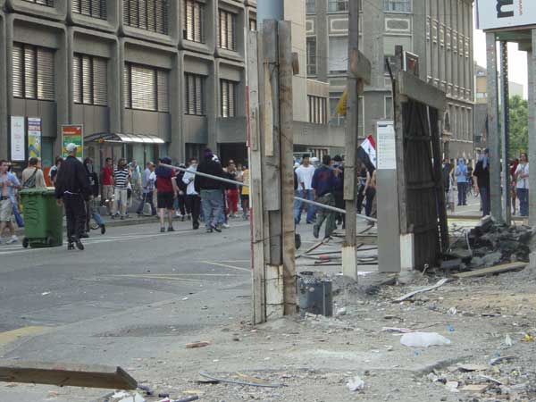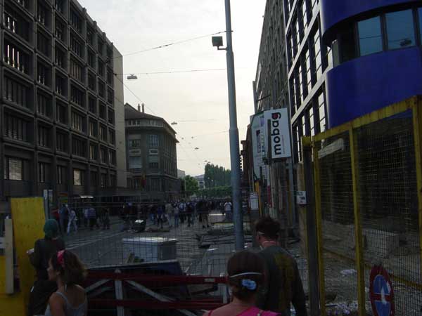 intanto il gruppo di giovani, abbandona il fronte della polizia e si sposta piu' in giu' nella strada iniziando a devastare cio' che trovano, nessun edificio particolarmente significativo, e a costruire barricate.