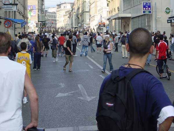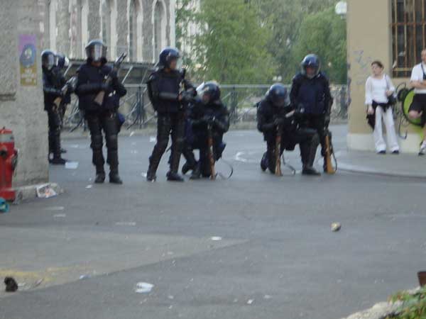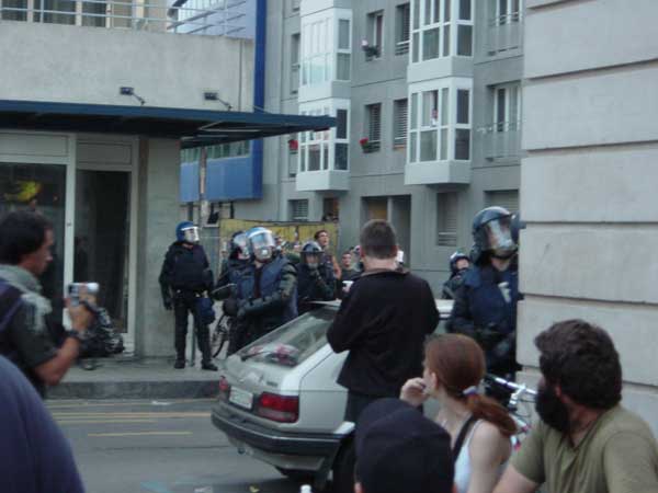 la situazione sembra abbastanza paradossale, il gruppo di persone che si fronteggia con la polizia, circa una quarantina, e' costituito in gran parte da minorenni, la tensione sale e scende tutte le volte che viene trovato e portato un nuovo cassonetto da cui prendere le bottiglie da tirare, la polizia rimane immobile durante i lanci e semmai dopo avanza sparando proiettili di gomma in aria. ciclicamente la scena si ripete.