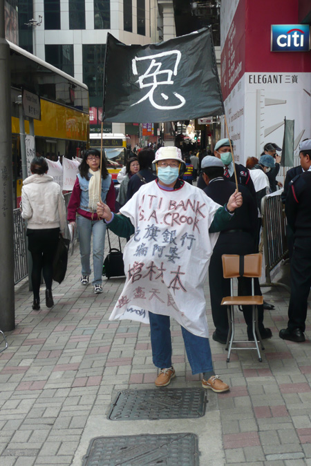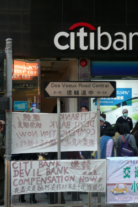 Scendere dal ferry a Hong Kong Island e trovare la protesta contro una banca. Impensabile in Cina. Succede a Hong Kong. La protesta fa seguito a contestazioni partite dal’inizio dell’anno dopo lo scandalo della Lehman Brothers Holdings Inc (l’avvio della crisi secondo i media mainstream), di fronte alla filiale di Hk della Citibank, accusata di avere “raggirato” migliaia di risparmiatori. La protesta è stata anche definita “automatica”: i protagonisti infatti, durante la pausa pranzo, hanno lasciato megafoni con voci registrate e cartelloni auto esplicativi sulla strada, di fronte alla sguardo allibito dei poliziotti e dei passanti.