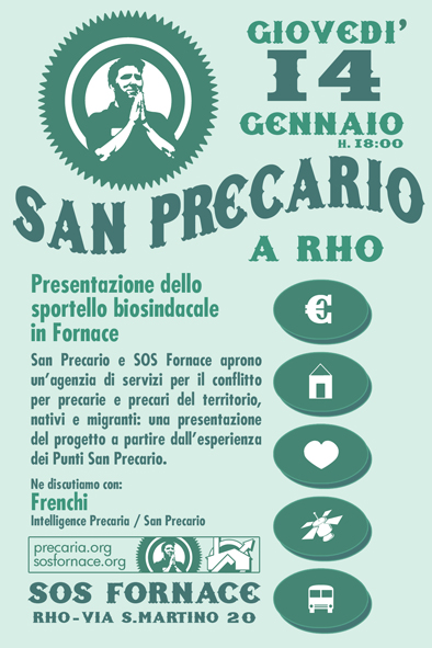 Giovedì 28 gennaio H18: San Precario starter-kit. come impostare e dar vita a una vertenza sindacale: strategie, strumenti e aspetti giuridico-legali. Uno starter-kit a cura dello sportello biosindacale per costringere il tuo padrone alla resa! Con la partecipazione dell’avvocato del lavoro Massimo Laratro