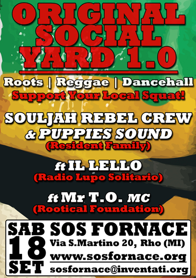 Irie Massive i sound residents del calibro di Souljah Rebel Crew e Puppies Sound, protagonisti attivi del progetto radio della Fornace, supportati in console dal veteranno Lello e al Mic da Mr T.O. riprendono il controllo del’Original Social Yard per inaugurare il primo appuntamento della stagione con la reggae music.