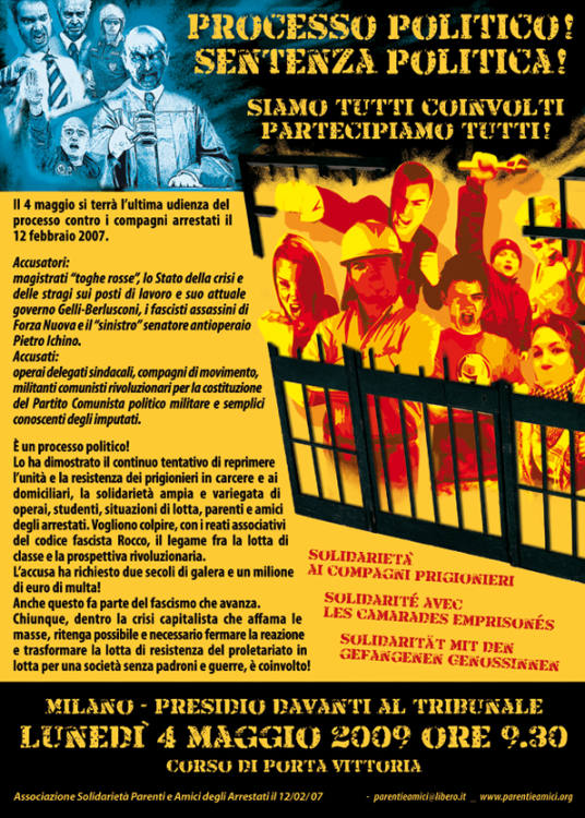 Lunedi 4 maggio alle ore 9.30 presso il Tribunale di Milano, Corso di Porta Vittoria, si terrà l'ultima udienza del processo ai compagni comunisti arrestati nell'ambito dell'Operazione Tramonto.
