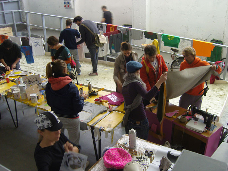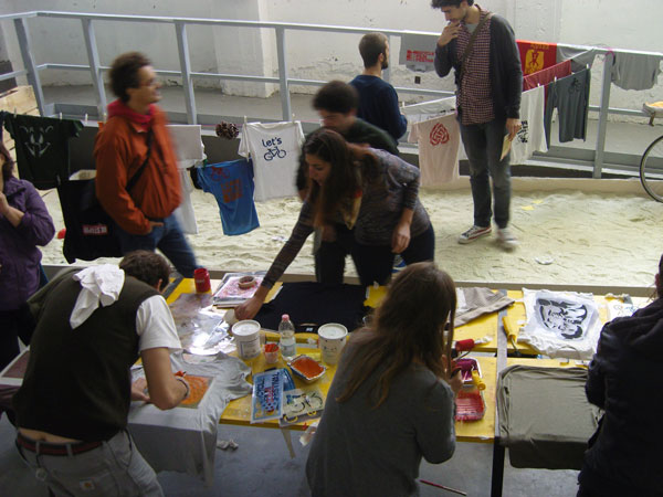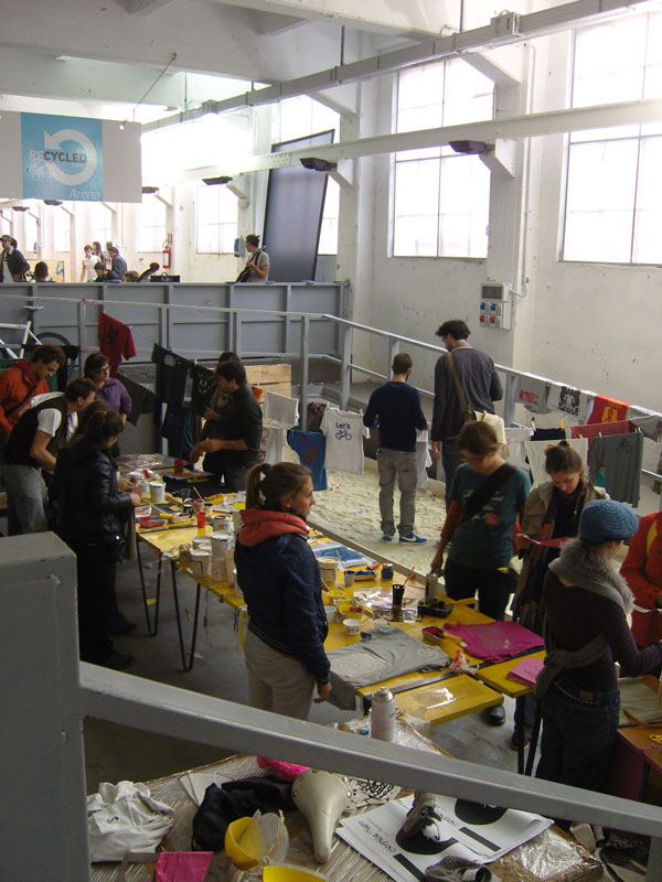 L’ultima giornata del festival, avvenuta all’area ex Ansaldo di via Tortona a Milano, si è conclusa in bellezza domenica 14 ottobre con un laboratorio molto partecipato di stencil su tessuto (perlopiù magliette rigorosamente portate da casa), con soggetti ciclici creati ad hoc. A dispetto del titolo scelto per la giornata dall’organizzazione — Lazy Sunday — si è lavorato-giocato-sperimentato-pasticciato dal mattino fino al pomeriggio inoltrato, mentre dall’altro lato del capannone partivano la Red Hook Criterium e le finali di un torneo di bike polo.