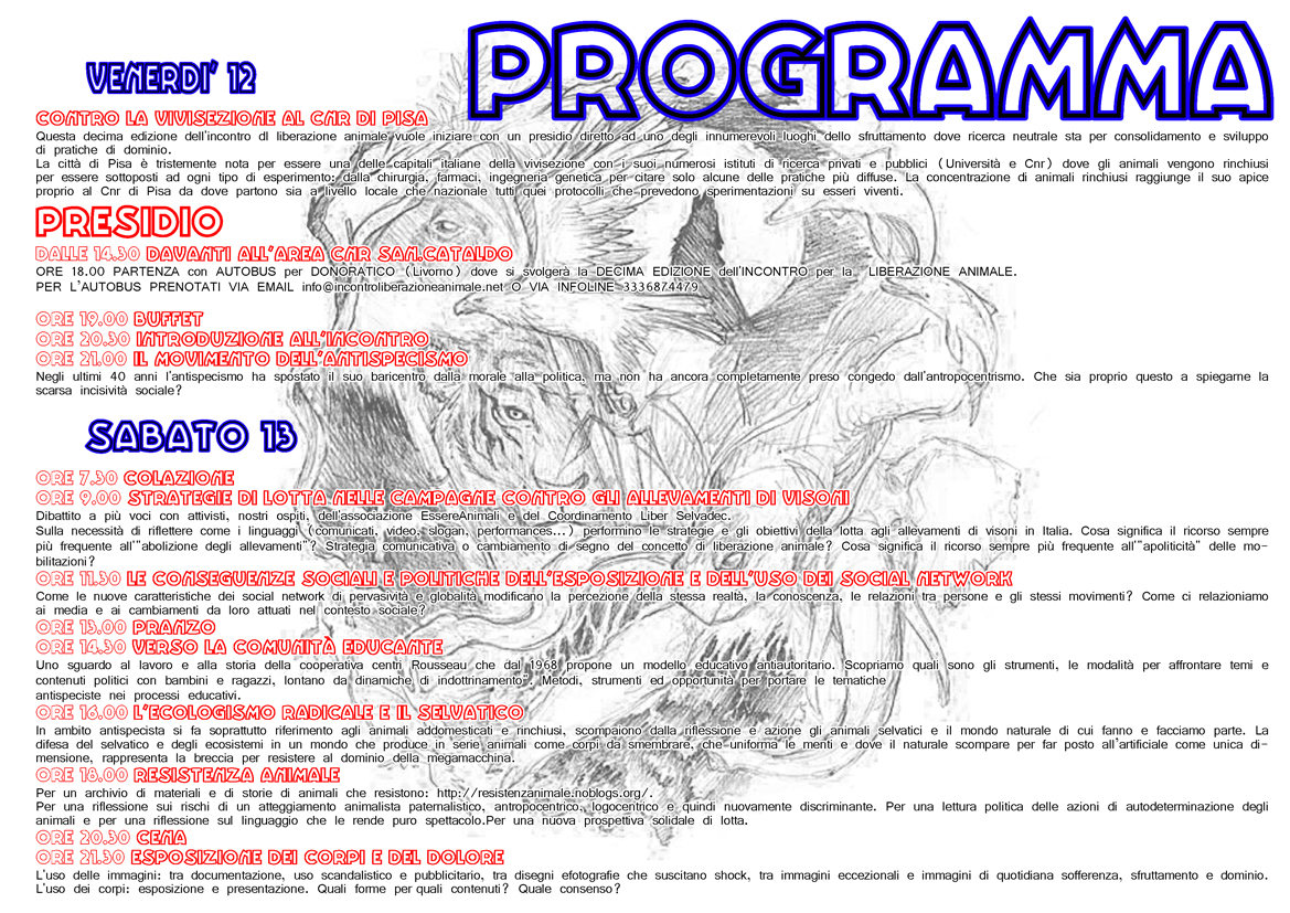 La visione antropocentrica pone la specie umana al centro del mondo attorno al quale tutte le restanti specie animali e vegetali si devono sottomettere e trasformarsi in utili strumenti a sua disposizione. Non permettiamo che per il piacere, per il profitto e il divertimento degli umani si continui a torturare e schiavizzare il mondo animale. Laboratori di vivisezione, mattatoi, allevamenti, circhi, parchi faunistici, acquari sono solo luoghi di morte e sofferenza.