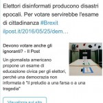 Mentre i mercati scivolavano nell’abisso e in Unione Europea scattava il panico, all’indomani della Brexit il sindaco di Bergamo Giorgio Gori ha deciso di postare e di rendere pubblica “un’analisi lucida” in un tweet: «Elettori disinformati producono disastri epocali. Per votare servirebbe l’esame di cittadinanza ‪#‎Brexit». http://www.ilpost.it/2016/05/25/democrazia-voto-ignoranti/ Centoquaranta caratteri che hanno innescato una moltitudine di […]