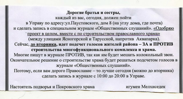 Кроме этих проблем присоединилась и новая — на месте бульвара между улицами Ясногорская и Тарусская районные власти лоббируют строительство торговых комплексов и православного храма. В районную управу пригоняют бомжей, чтобы они голосовали за проект, а также используют священнослужителей для формирования правильного мнения у верующих. Подробно об этом: http://community.livejournal.com/msk_gorod_sad/35536.html.