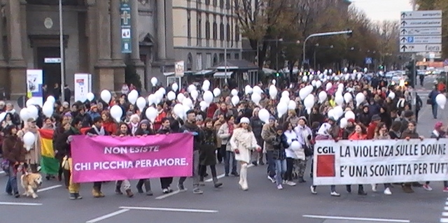 Il corteo ha sfilato silenzioso dalla stazione a piazza Pontida: donne e uomini, giovani e meno giovani, tutti dietro lo striscione “Non esiste chi picchia per amore”. Presenti anche più di 120 palloncini bianchi: su ognuno il nome di una donna uccisa nel 2013. Al termine del corteo i nomi delle vittime di femminicidio di quest’anno sono stati letti al microfono, e dopo ogni nome un palloncino veniva lasciato libero di volare.